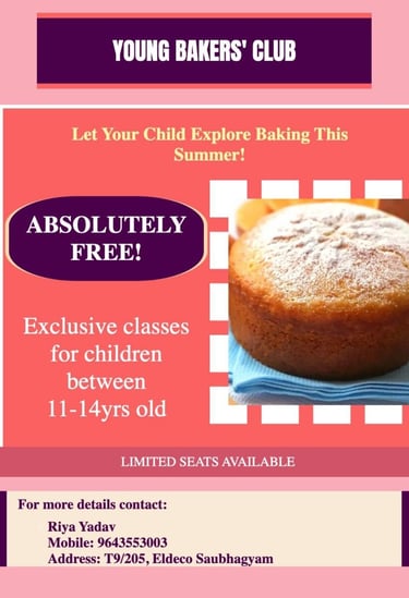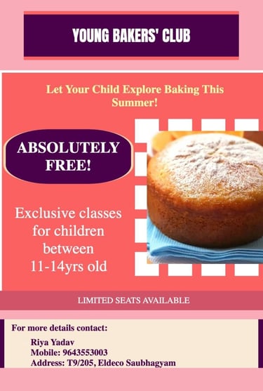 Baking has always been a passion of mine, and during my summer break, I decided to turn it into a way of giving back to my community. I organized free baking classes for young girls in my residential society, hoping to share the joy of creating something with their own hands. I designed flyers, structured lessons, and created a collaborative model where participants brought their ingredients, learned the process at my home, and shared the finished cakes together. Over several sessions, I taught six girls, aged 11 to 15, how to bake eight different types of cakes. What began as a small idea soon became a warm community activity filled with laughter, learning, and creativity. Leading the classes not only helped me refine my own baking skills but also strengthened my ability to teach, organize, and inspire. Watching the girls grow confident in the kitchen reaffirmed my love for leadership and meaningful connection.