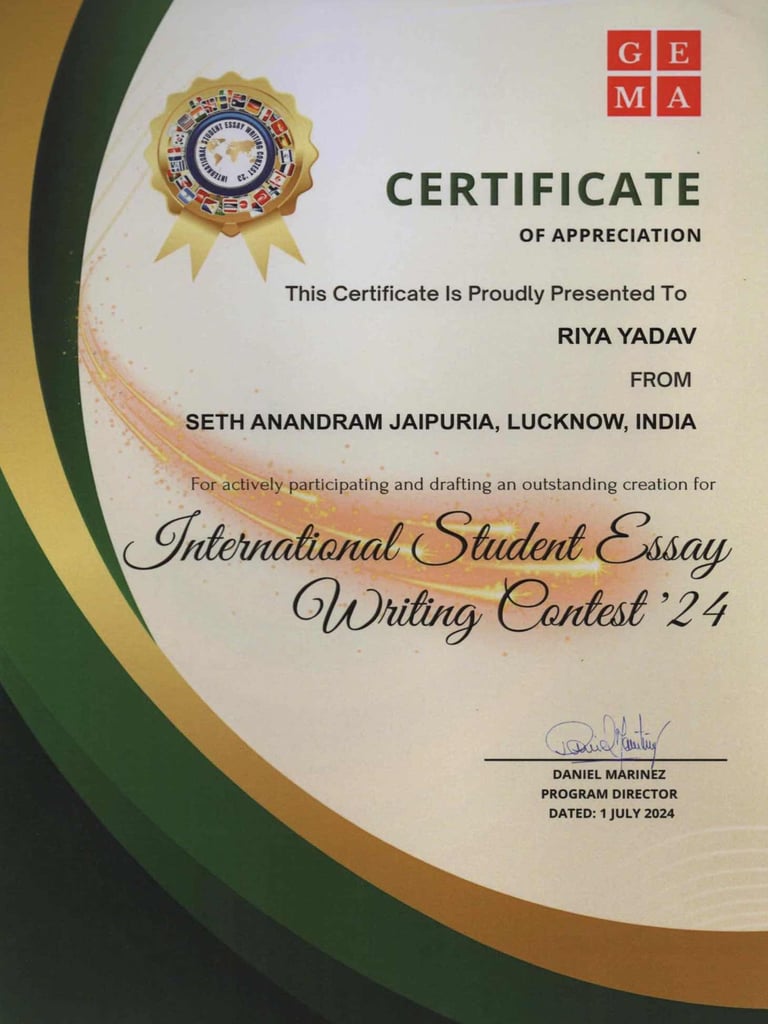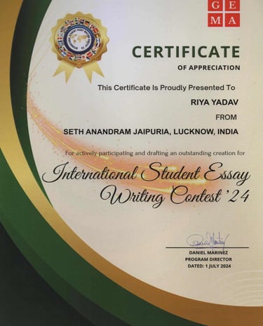 In grade 11, I participated in an essay writing competition organized by GEMA, focused on the theme of volunteering and giving back to the community. The contest encouraged students to reflect on the value of service and its role in shaping a compassionate society. In my essay, I emphasized that true progress is not defined by individual achievements but by collective growth. I wrote about how volunteering nurtures empathy, strengthens human connections in an increasingly isolated world, and teaches children the importance of compassion and responsibility. Drawing from real-life examples, I aimed to inspire others to see giving back as both a duty and a source of fulfilment. My essay earned me recognition for Outstanding Performance, but more importantly, it deepened my belief that meaningful change begins when individuals act selflessly for the greater good.Write your text here...