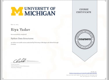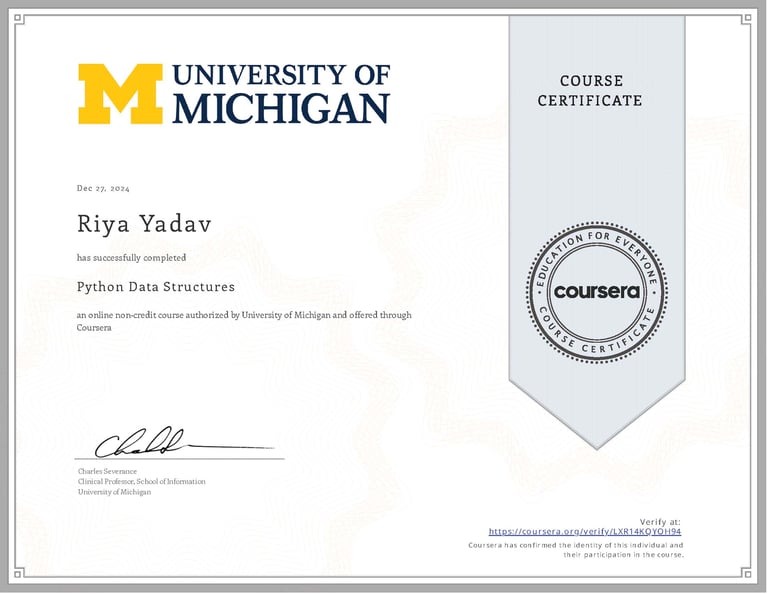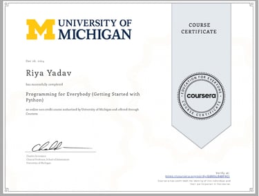 While in high school, my curiosity and eagerness to learn pushed me to explore online courses beyond the classroom. I enrolled in two Python programming courses by the University of Michigan on Coursera—one beginner-level and one advanced. I wanted to strengthen my foundation in coding and understand how data structures work in real applications. The first course introduced me to Python’s basics—syntax, loops, and conditionals—while the second deepened my understanding of lists, dictionaries, and tuples. I completed every assignment and debugged each program independently, driven by a desire to learn as much as I could. These courses gave me not just technical knowledge but also confidence in my ability to self-learn through online resources, fueling my motivation to continue exploring the vast world of computer science.